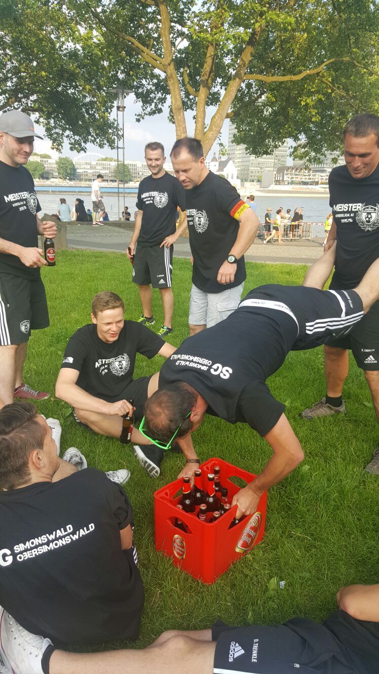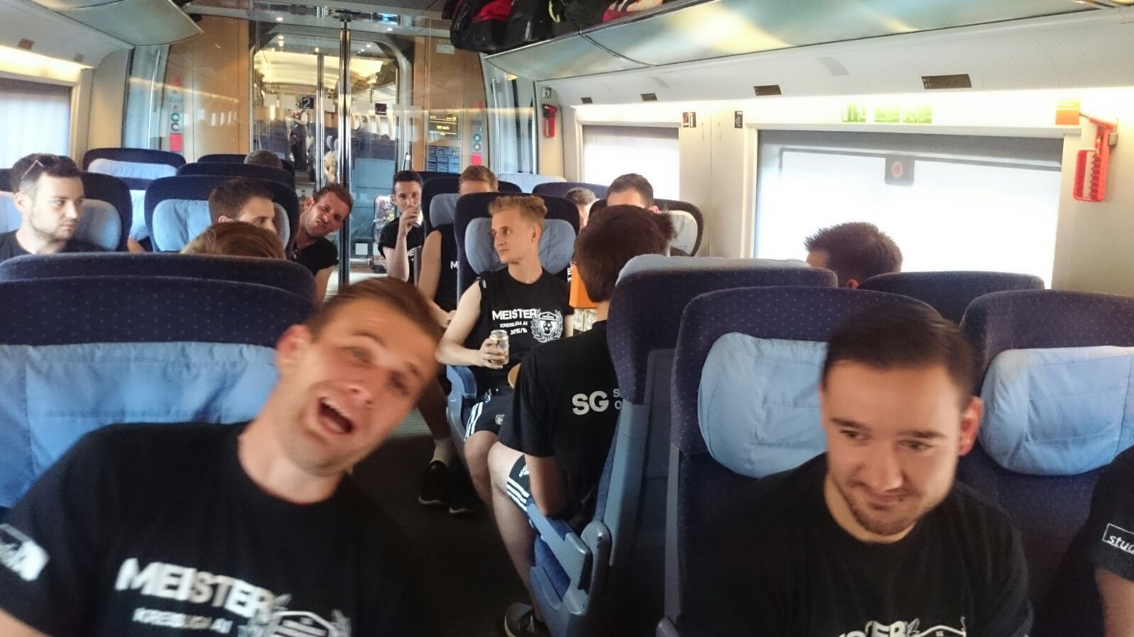 Am Freitag den 24.06.2016 begann der Abschluss einer rundum erfolgreichen Saison – Meisterfeier 2.0! Über die Zwischentreffpunkte Bleibach und Waldkirch traf sich die komplette erste Mannschaft der SGSO in Freiburg am Hauptbahnhof. Dresscode – Meistershirt natürlich!Von dort aus ging es mit dem ICE in Richtung „Stadt met K“. Schon im Zug stieg die Vorfreude mit kölsch’er Musik und super Stimmung weiter an. Für die dreistündige Fahrt hatte die deutsche Bahn eigentlich keinen Partywaggon vorgesehen – wir schon!