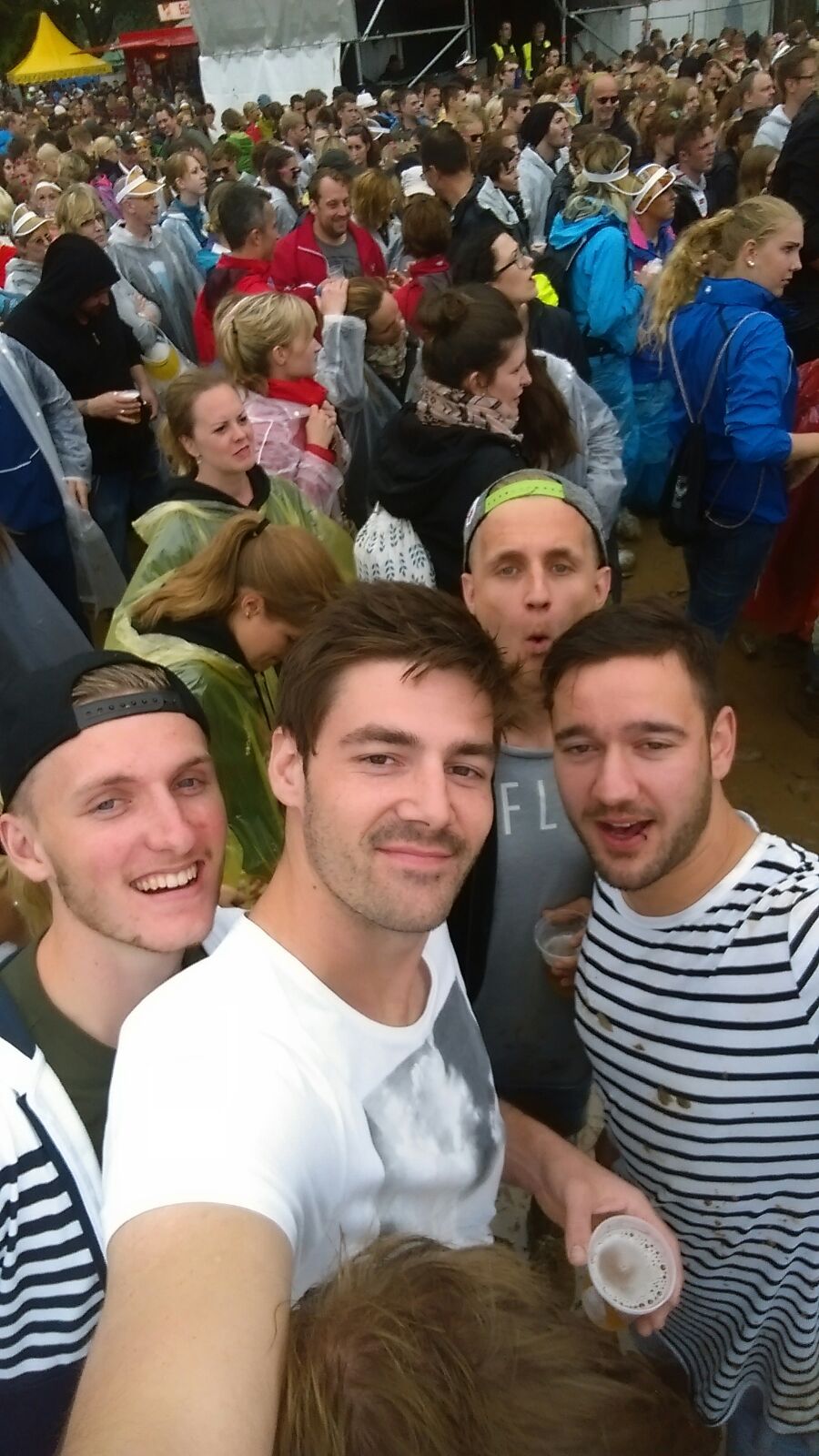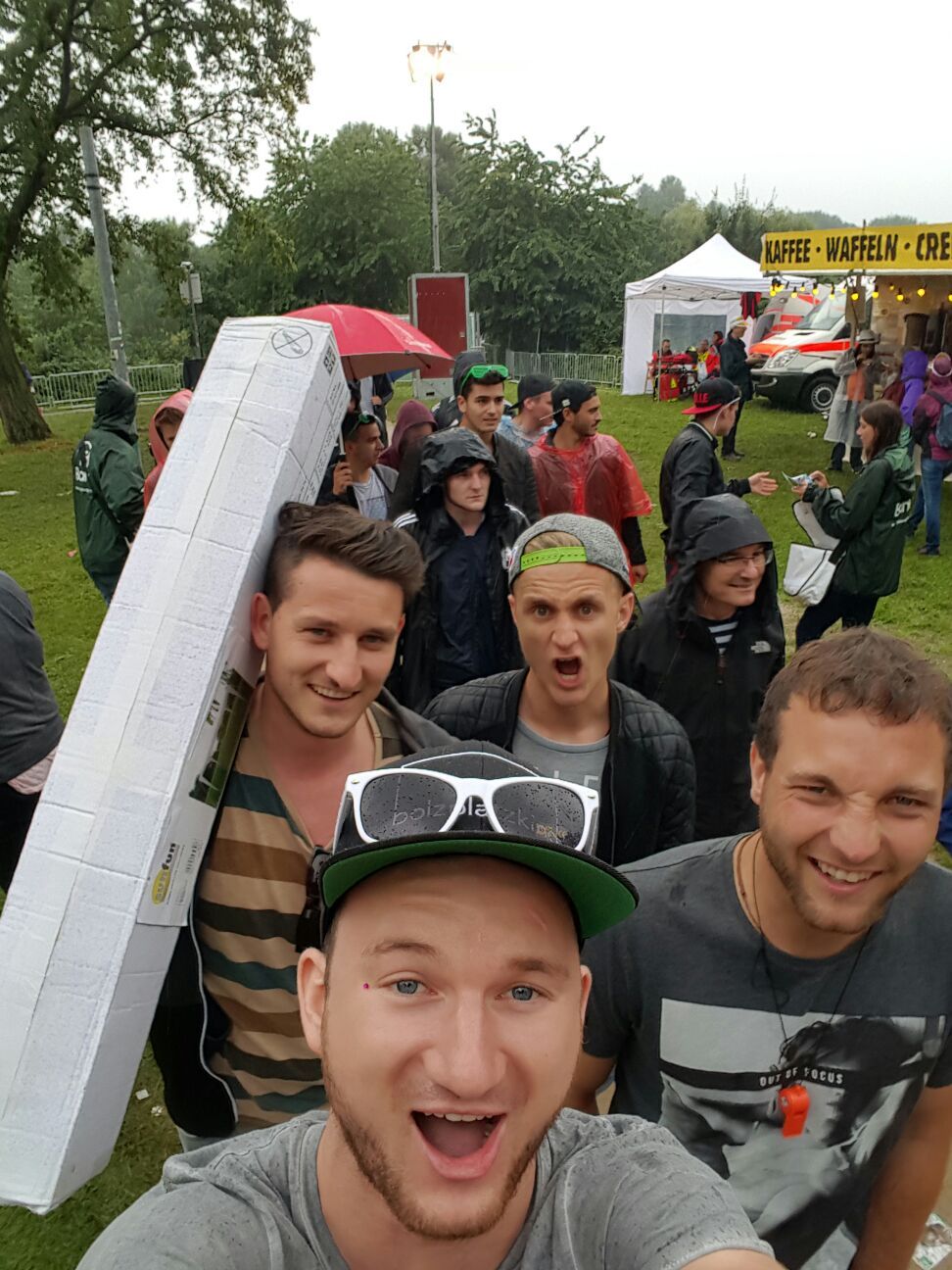 Mit an Bord von Taxi 1 waren Bauleiter Dischle sowie sein Montageteam Olli, Paddy B. und s’Grummholze Pascal, die das Pavillon zuerst gekonnt ins Gelände schleusten und dann im Handumdrehen aufgebaut hatten. Das Ganze zur Freude vieler anderen Festivalbesucher, die ebenfalls unterstanden – natürlich nicht umsonst. Die ersten Runden Kölsch waren Standgebühr.Nachdem sich ein größerer Teil der Mannschaft unter dem Pavillon versammelt hatte, schwanden mit der Zeit jegliche Hemmungen zwecks Regen und Matsch. Die anfänglich bedachte Feier entwickelte sich mit jedem Stimmungslied zu einer legendären Party im Matsch. Spätestens nach dem Marsch mit dem Pavillon quer über das Gelände bis fast vor die Bühne, deswegen anschließendem „Zwangsabbau“, war‘s sowieso egal. Scheiß auf Schuhe, Kleider und s‘ Wetter – „Alle Jläser huh“! Zu den Klängen vieler bekannter, kölsch’er Bands wie die Höhner, Kasalla und Brings, wurde mit 17000 Kölner richtig abgefeiert.